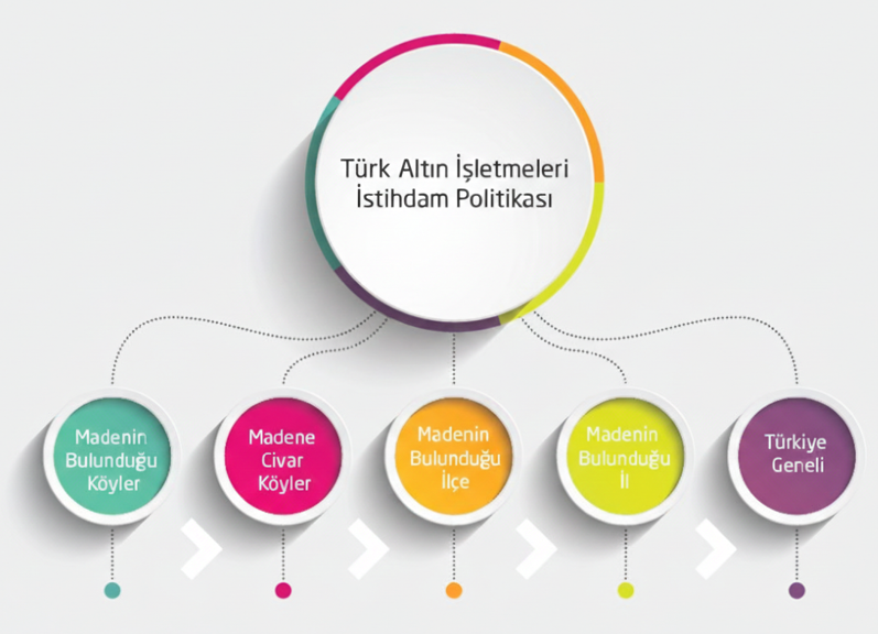 Türk Altın İşletmeleri A.Ş. olarak; çalışanlara, topluma, yaşam değerlerine, eğitime, çevreye, ekonomiye katma değer sağlayan; kalıcı ve sürdürülebilir altın madenciliği yapmak hedefi ile oluşturduğumuz İnsan Kaynakları Politikamızda amacımız doğru işe, doğru kişinin istihdamını sağlayarak bu amaç doğrultusunda, konusunda uzman ve yetkin personelimiz ile şirketimizi liderliğe taşımaktır. Türk Altın İşletmeleri A.Ş.'nin İnsan Kaynakları Politikası' nın bir diğer unsuru da yöreden istihdama önem vermesidir. Bu politika doğrultusunda gerçekleşen istihdam neticesinde yöreden çalışan oranımız Çukuralan İşletmemiz için %88, Ovacık İşletmemiz için %87, Gümüşhane İşletmemiz için %89, Himmetdede İşletmemiz için %94, Kaymaz İşletmemiz için %96'dir. Bünyesinde çalışan herkes dil, din, ırk, mezhep, yaş, cinsiyet, uyruk, maluliyet ayrımı yapılmaksızın eşit kabul edilmektedir. İnsan haklarına saygı ile başlayan politikamız çerçevesinde doğru işe doğru insan, eşit işe eşit ücret ve herkese eşit fırsat yaratarak gerçek sermayenin insan olduğunun önemi vurgulanmaktadır.